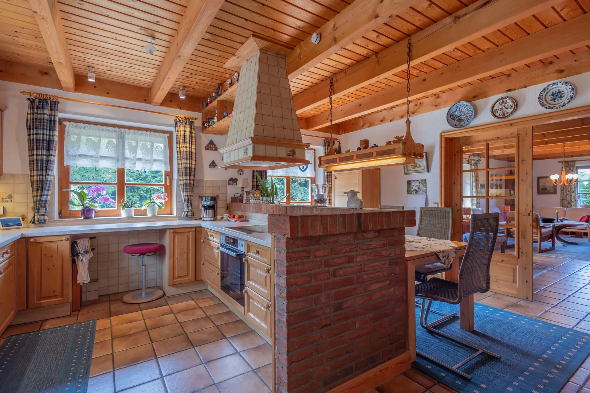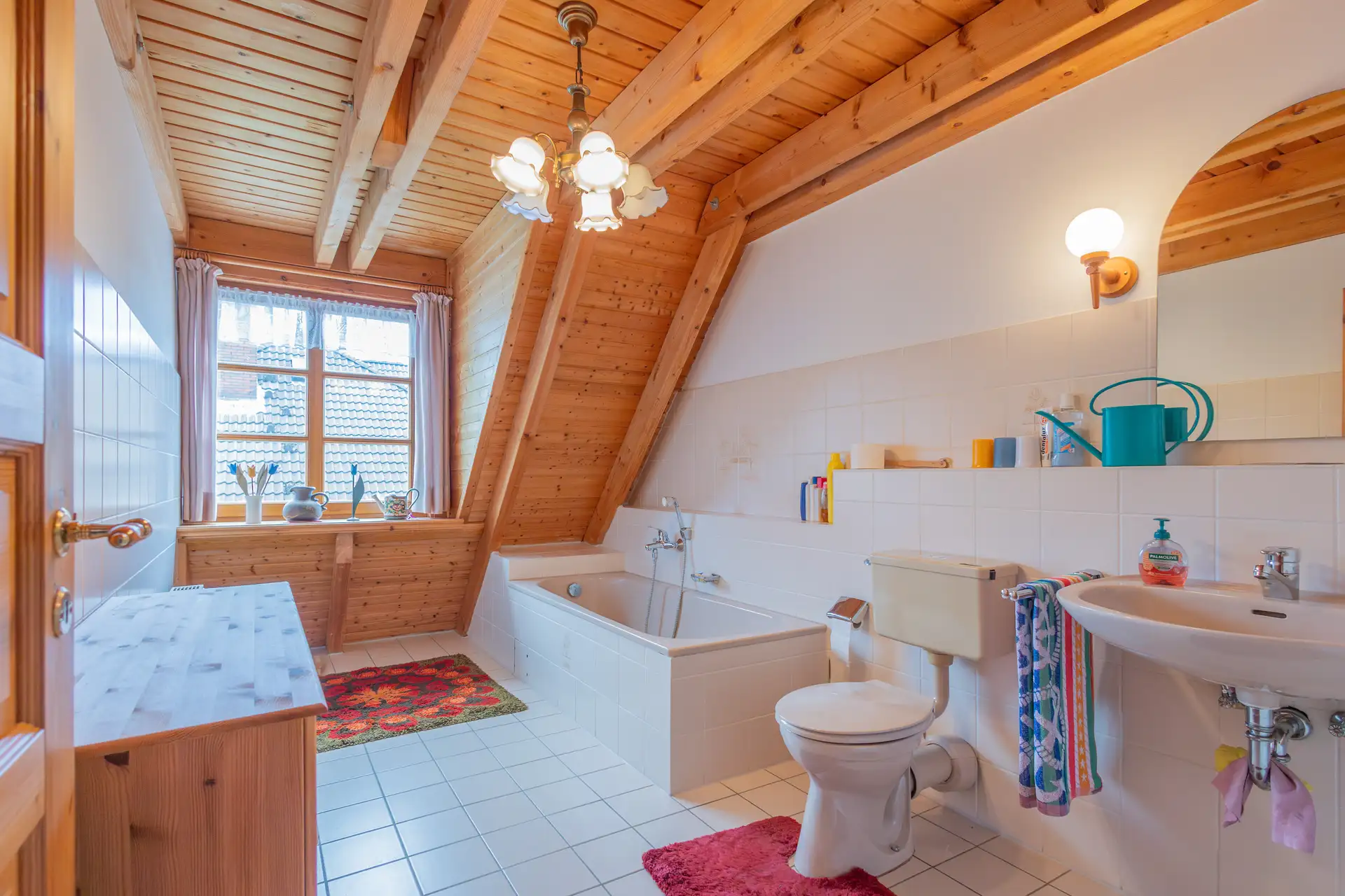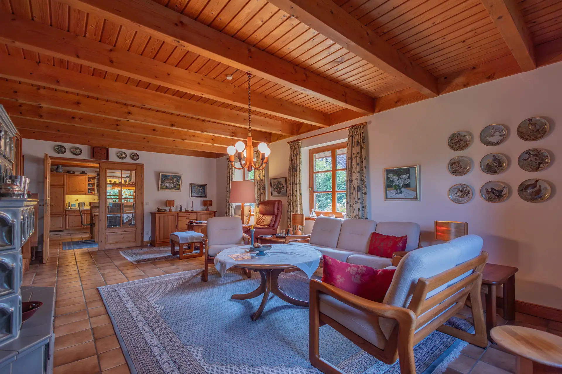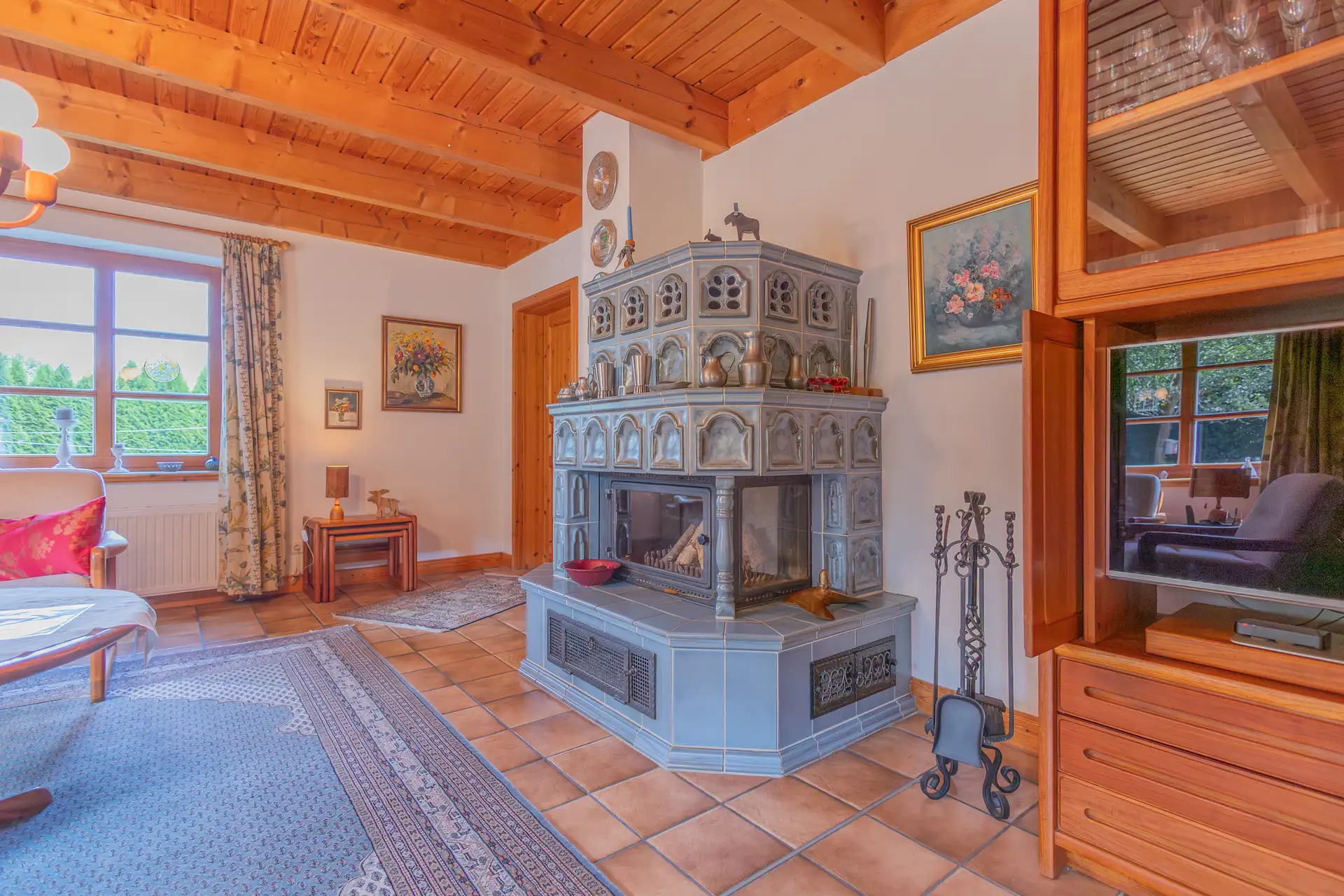 Von der Küche aus führt Sie eine doppelflügelige Sprossentür aus Massivholz in den rund 33 m² großen Wohnbereich. Durch die Glastüren fällt das Licht weich auf den Fliesenboden, der Kachelofen zieht die Blicke auf sich, und obwohl er nach GEG erneuert werden muss, ist der Schornstein bereits mit Schamotterohr vorbereitet.