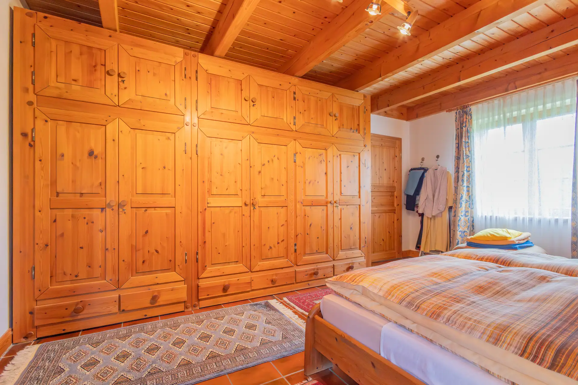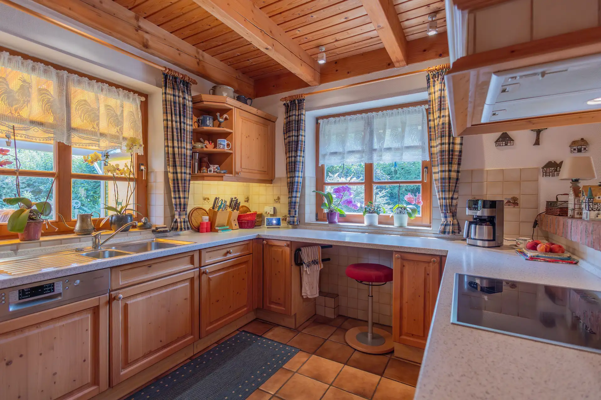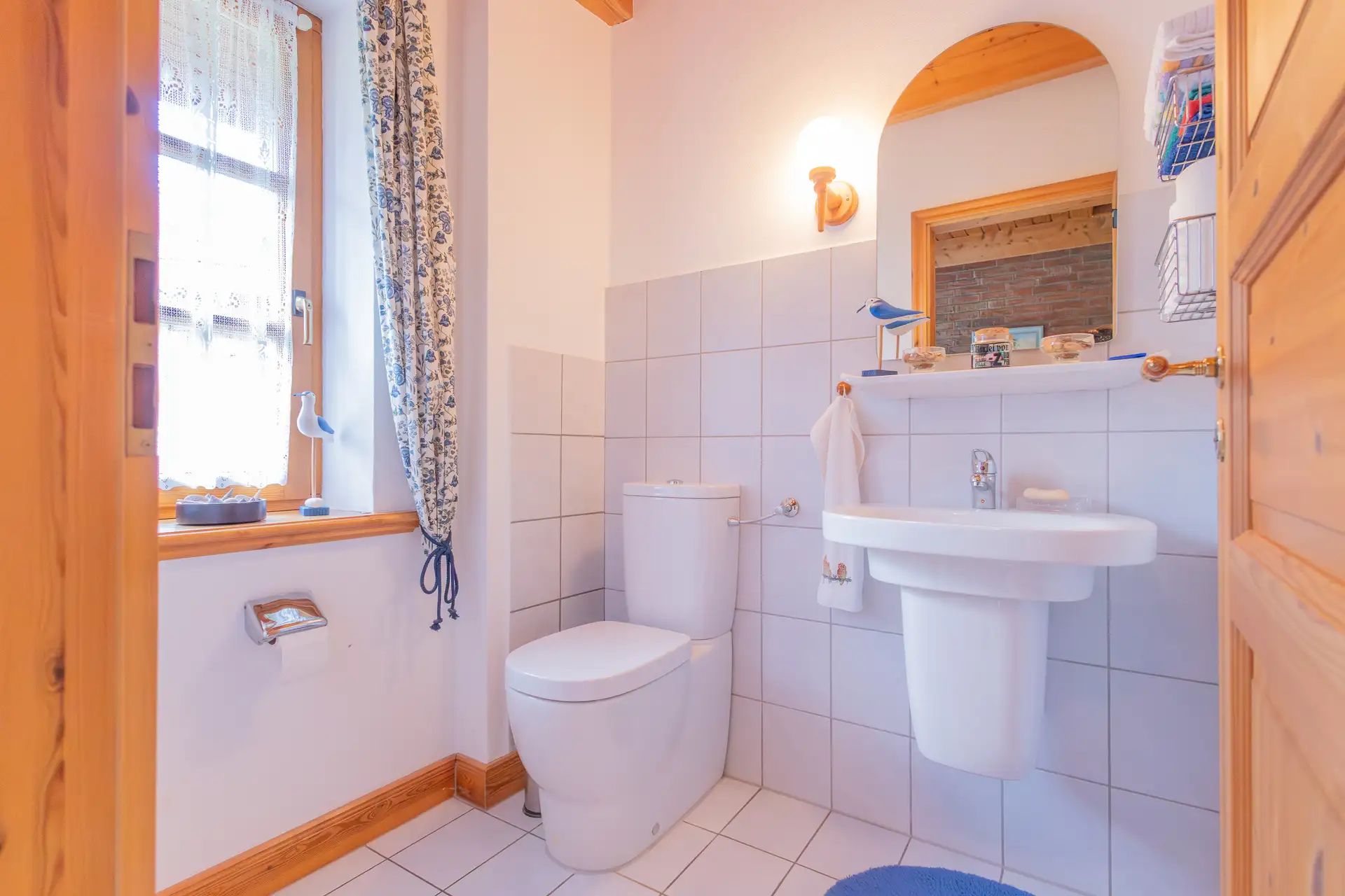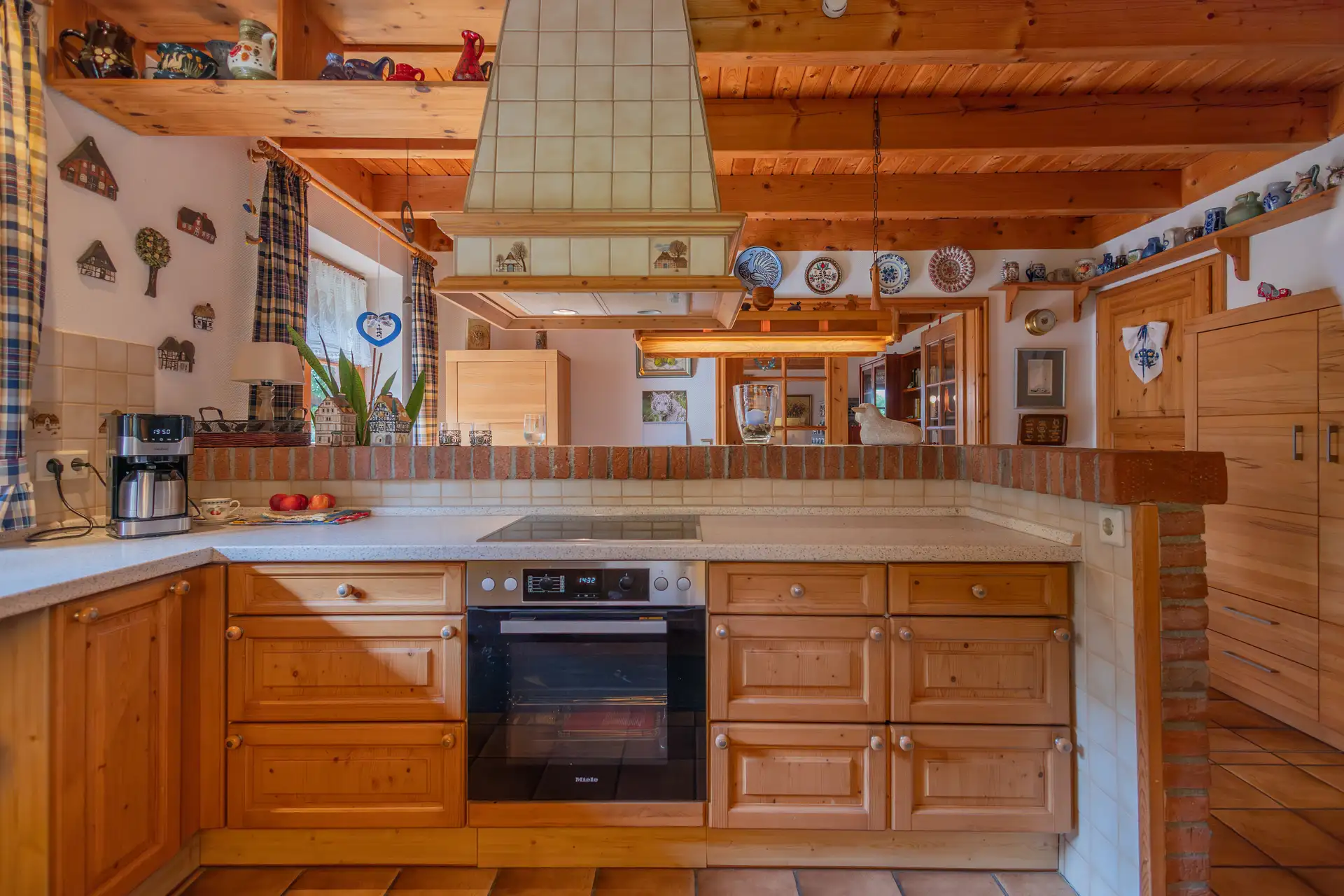 Von der Küche aus führt Sie eine doppelflügelige Sprossentür aus Massivholz in den rund 33 m² großen Wohnbereich. Durch die Glastüren fällt das Licht weich auf den Fliesenboden, der Kachelofen zieht die Blicke auf sich, und obwohl er nach GEG erneuert werden muss, ist der Schornstein bereits mit Schamotterohr vorbereitet.