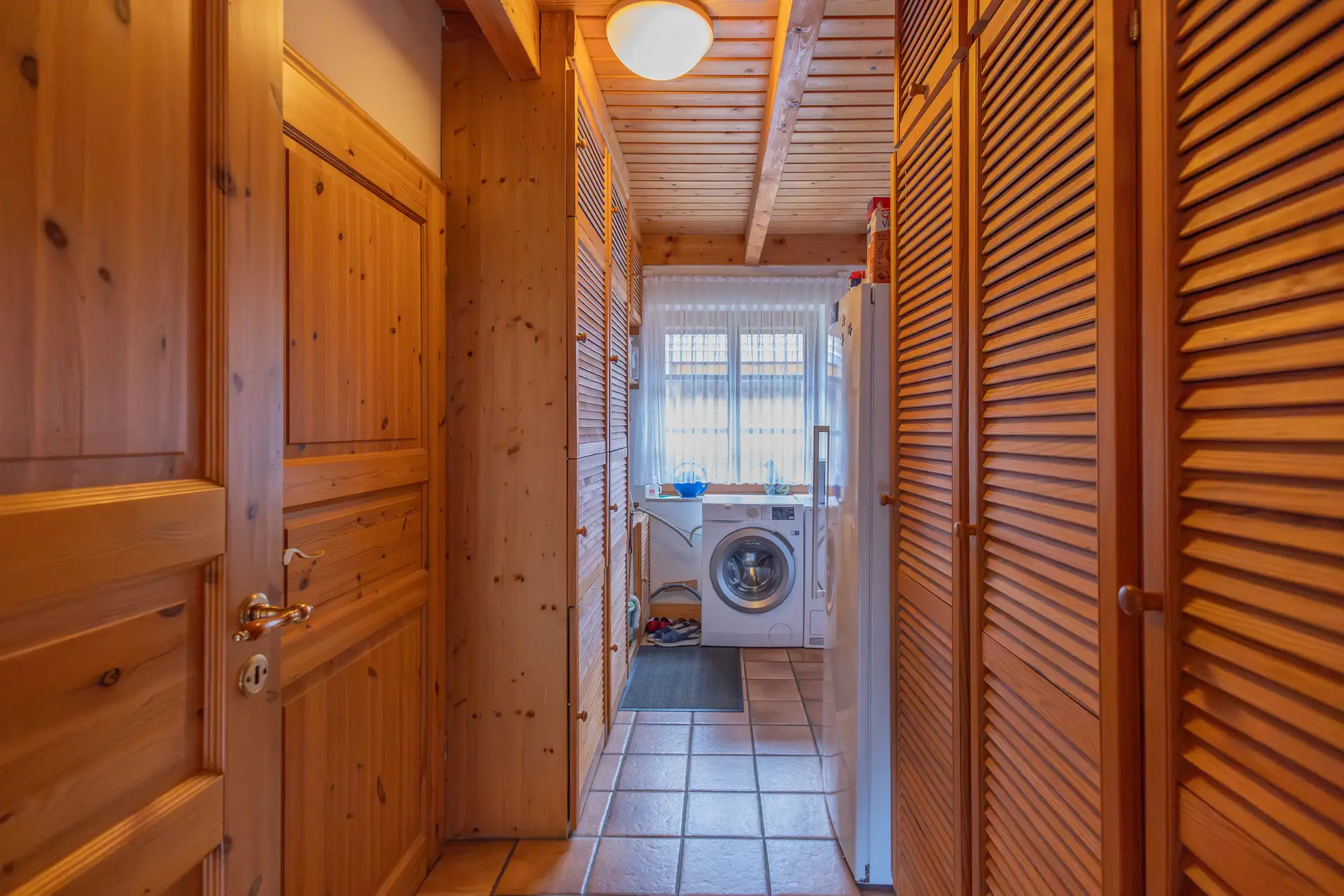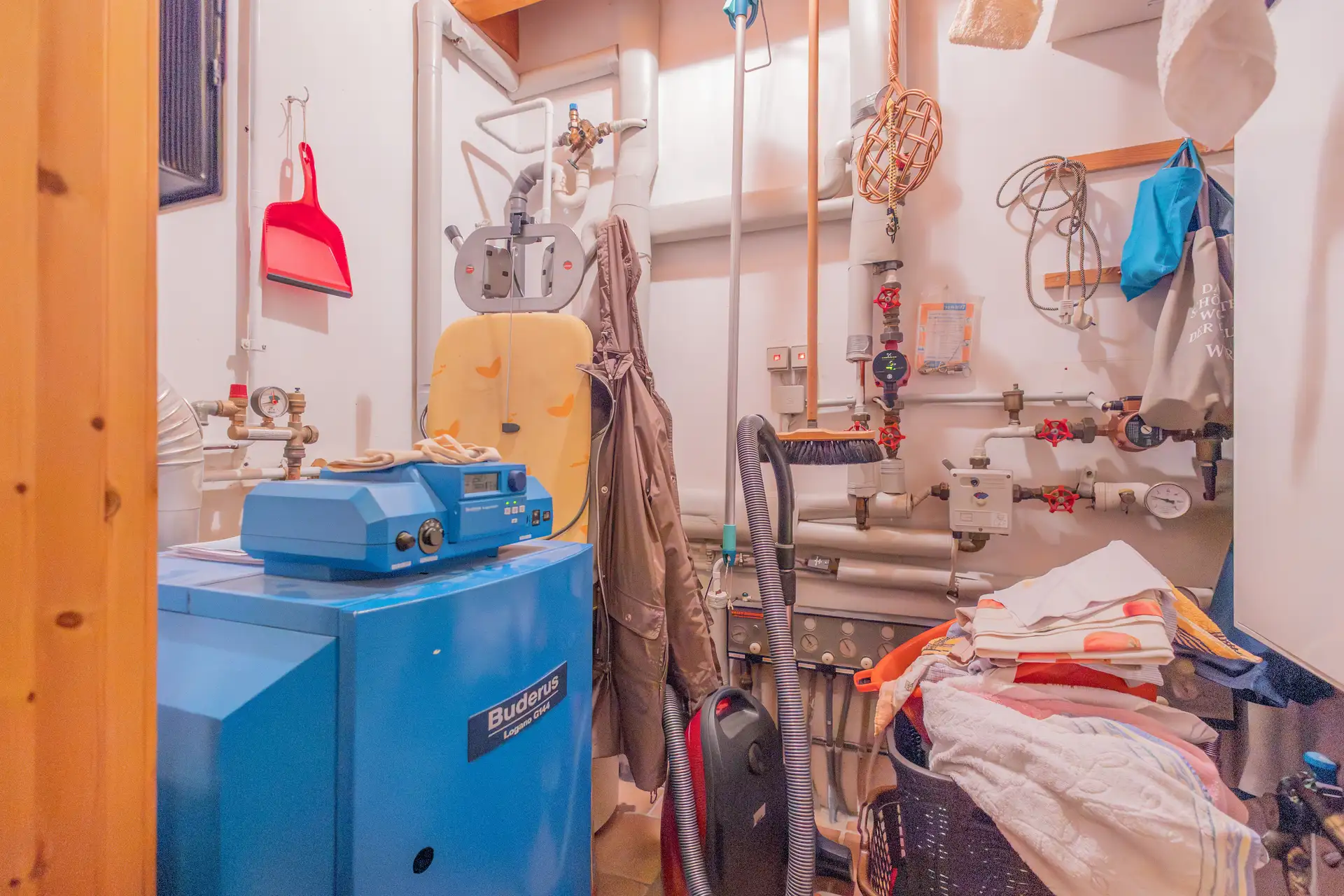Der effizient genutzte Hauswirtschaftsraum schließt direkt an die Küche an und bietet nicht nur praktischen Stauraum, sondern auch Zugang zur überdachten Terrasse. Von hier aus gelangt man in den innenliegenden Heizungsraum, der mit einer Gas-Niedertemperaturheizung aus dem Jahr 2015, den Speichern, der 2024 installierten Solaranlage, sowie der Steuerung für die Fußbodenheizung ausgestattet ist. Die Fußbodenheizung im Erdgeschoss sorgt für behagliche Wärme an kalten Tagen, während die moderne Solaranlage mit 13,5 kWh Speicher, 6,5 kWp Leistung und einer Powerwall 2 eine nachhaltige, zukunftsorientierte Energieversorgung garantiert. Hochwertige Kowa-Holzfenster mit Sprossenteilung und solide Massivholztüren unterstreichen die Wertigkeit des Hauses. Für Fahrzeuge stehen eine Garage mit integrierter Werkstatt sowie ein Carport mit E-Ladestation bereit.