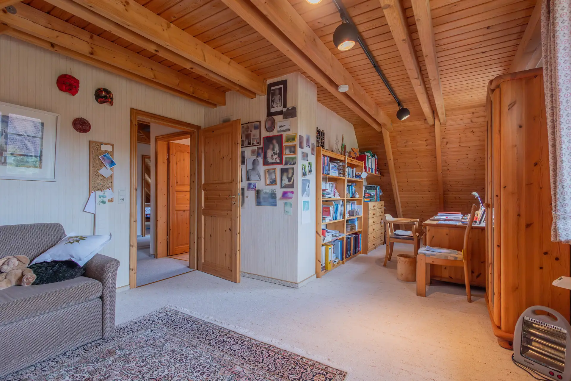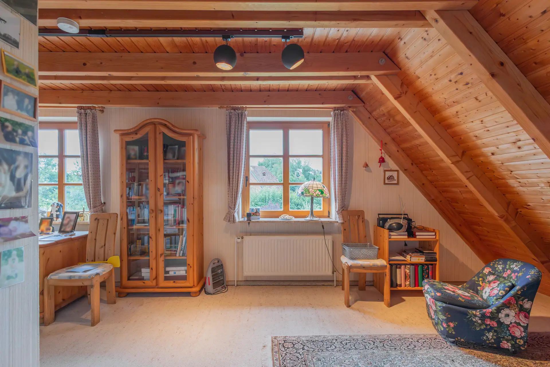 Im Obergeschoss erwarten Sie zwei Schlafzimmer: eins mit ca. 15 m² und das andere mit ca. 17 m². Ein nach Süden ausgerichtetes Arbeitszimmer in L-Form, perfekt für konzentriertes Arbeiten oder kreative Projekte. Dazu ein Wannenbad und eine Abstellkammer für alles, was nicht im Blick sein muss.
