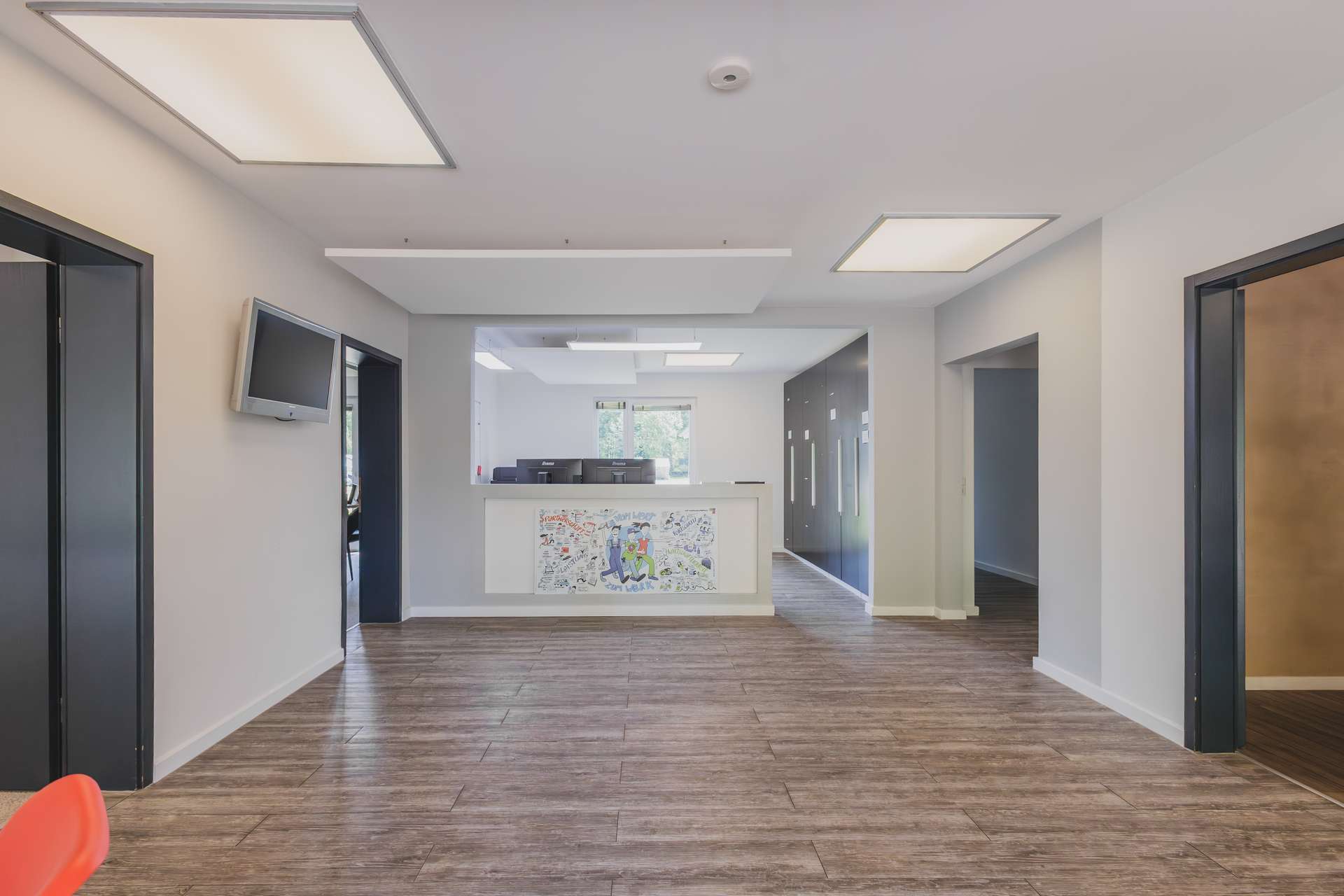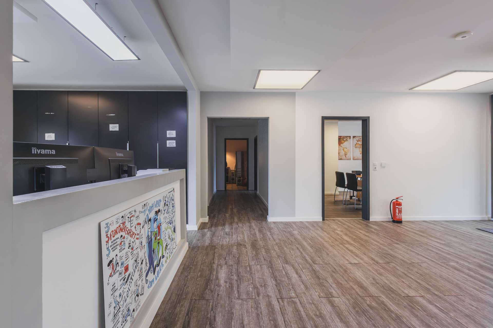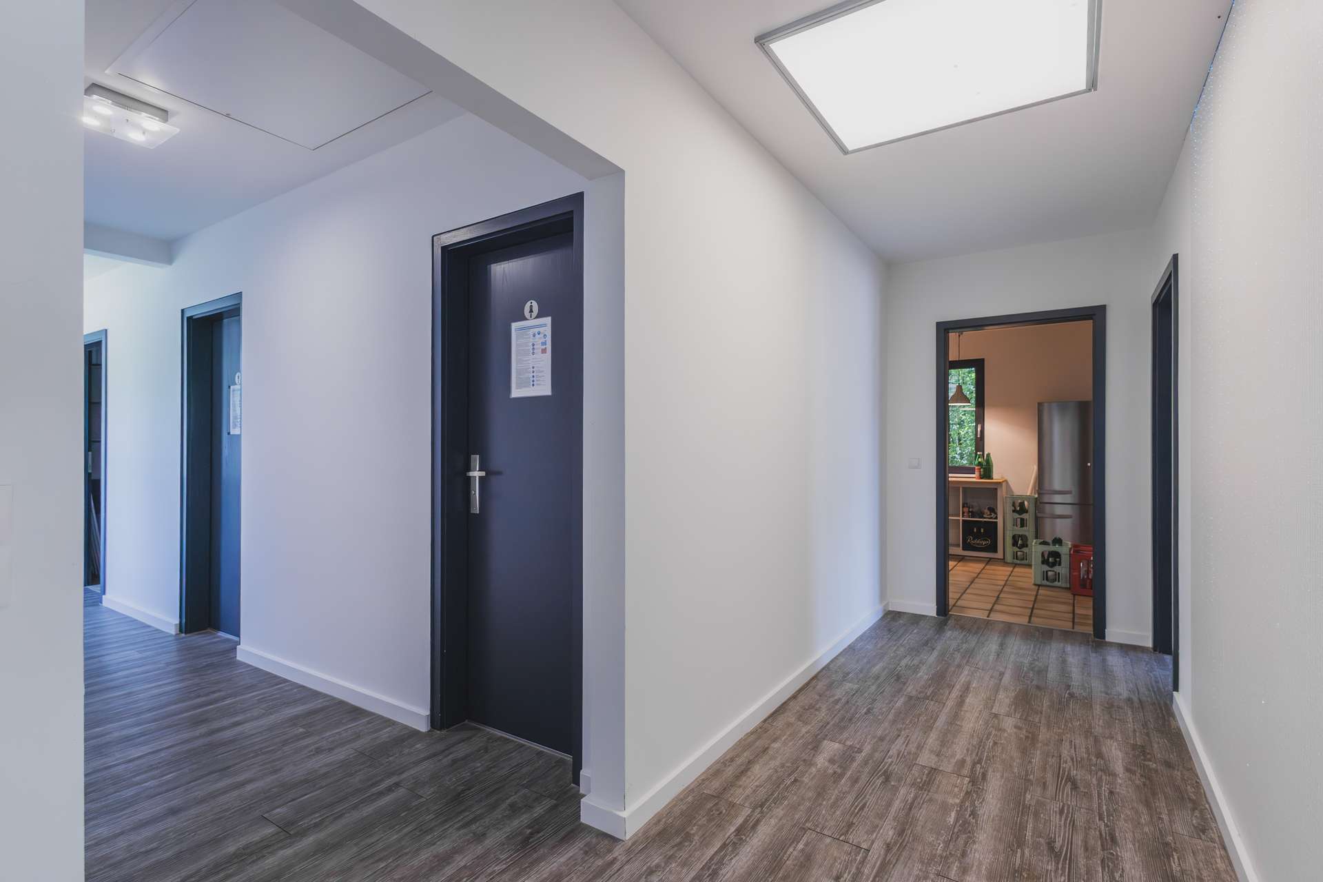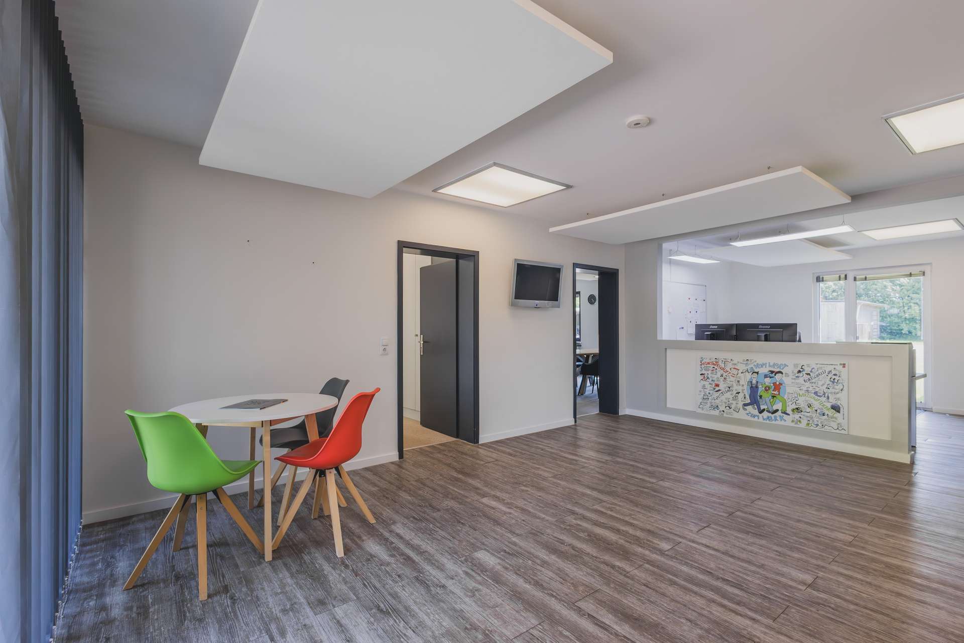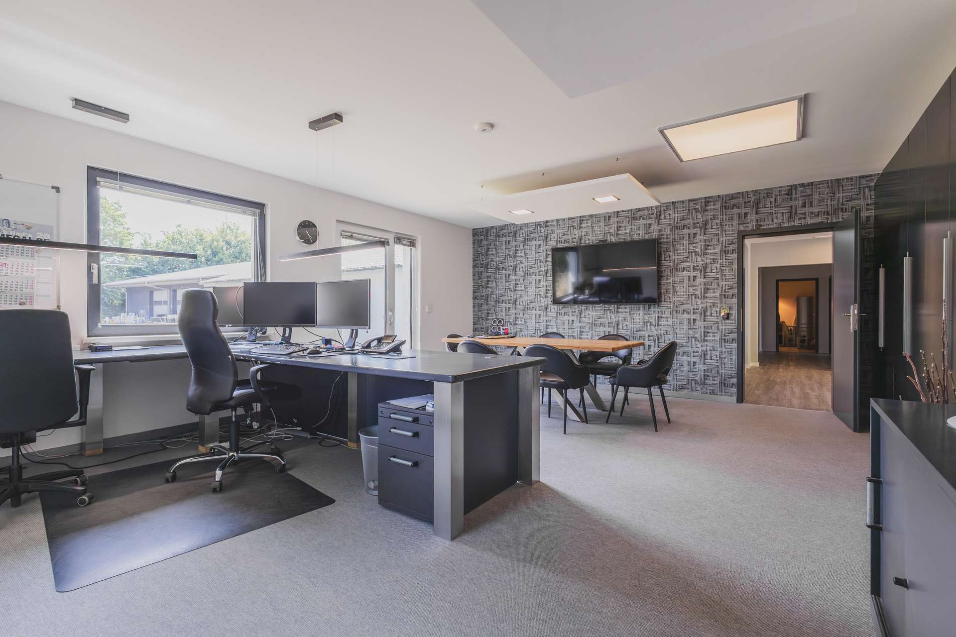 Die Raumaufteilung ist durchdacht, die Materialien gut gewählt: Robuster Vinylboden in Holzoptik, Teppich im Hauptbüro, eine Einbauküche im Aufenthaltsraum sowie separate Sanitäranlagen für Damen und Herren schaffen ein Arbeitsumfeld mit Wohlfühlfaktor. Großzügige Fensterflächen sorgen für lichtdurchflutete Räume, moderne Beleuchtung und eine optimierte Raumakustik runden den Komfort ab.