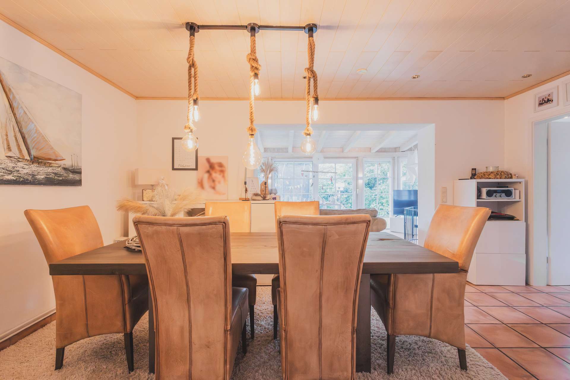 Das Herzstück des Hauses ist das offene Wohnzimmer mit angrenzendem Essbereich und gemütlichem Wintergarten. Insgesamt rund 54 m² Wohnfläche laden zu geselligen Abenden, entspannten Stunden vor dem Kamin und lichtdurchfluteten Momenten ein. Der Wintergarten überzeugt mit sieben bodentiefen Fenstern, einer Schiebetür in den Garten, einen Kaminofen und seiner einzigartigen Atmosphäre – ein Ort, der einfach hyggelig ist. Ein zusätzlicher, etwas abgetrennter Bereich eignet sich ideal als Büro oder Leseecke.