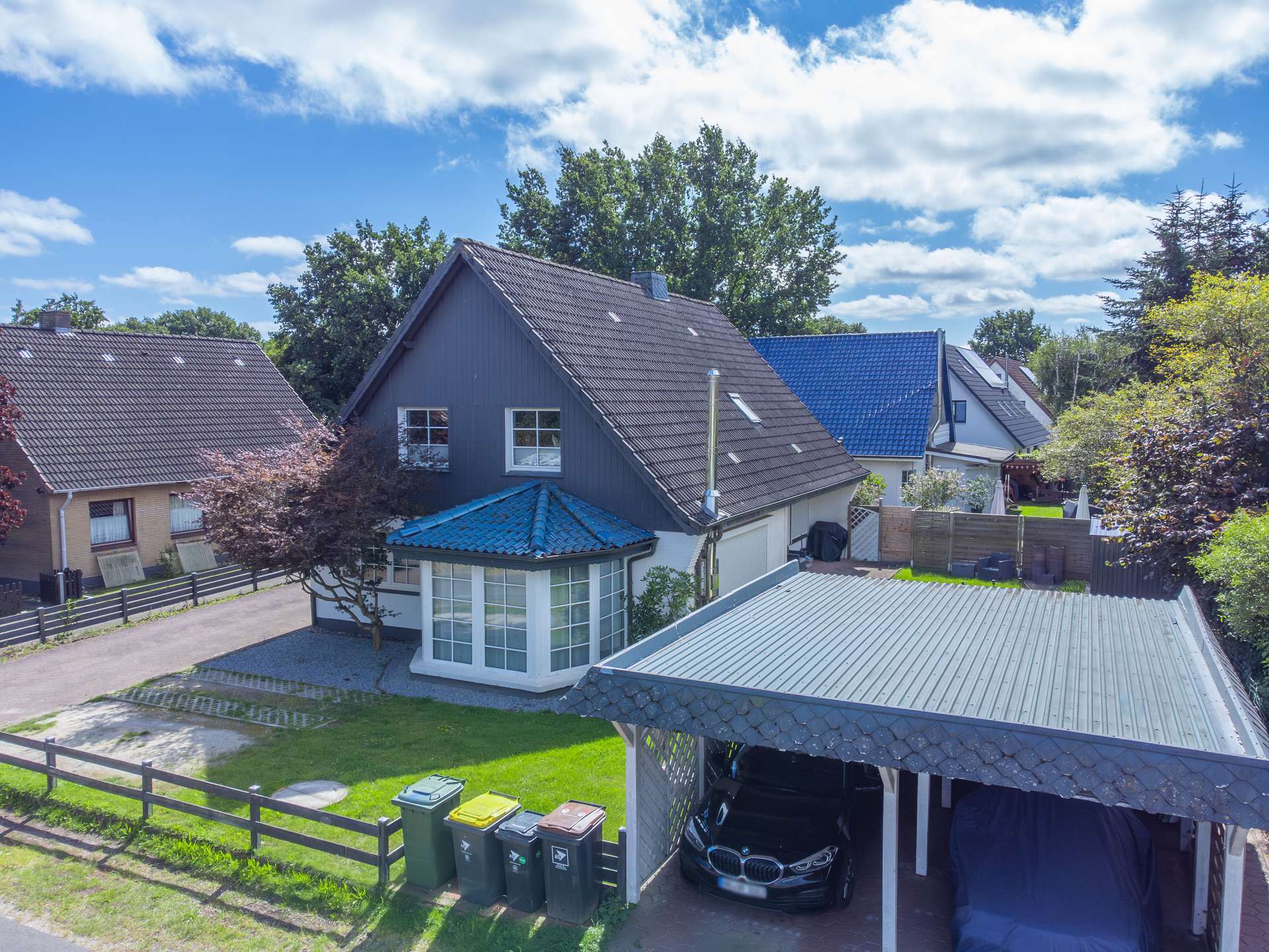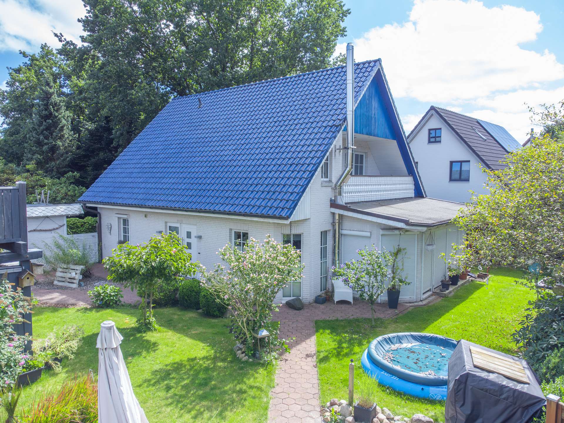 Hier eröffnet sich Ihnen die einzigartige Möglichkeit, ein Wohnensemble der besonderen Art zu erwerben. Das Grundstück umfasst ca. 1.074 m² und beherbergt zwei Häuser: ein hyggeliges Einfamilienhaus aus dem Jahr 1998 sowie ein Zweifamilienhaus aus dem Jahr 1972 im vorderen Bereich des Grundstücks. Die Außenflächen sind so aufgeteilt, dass jedes Haus seinen eigenen, klar abgegrenzten Bereich genießt.