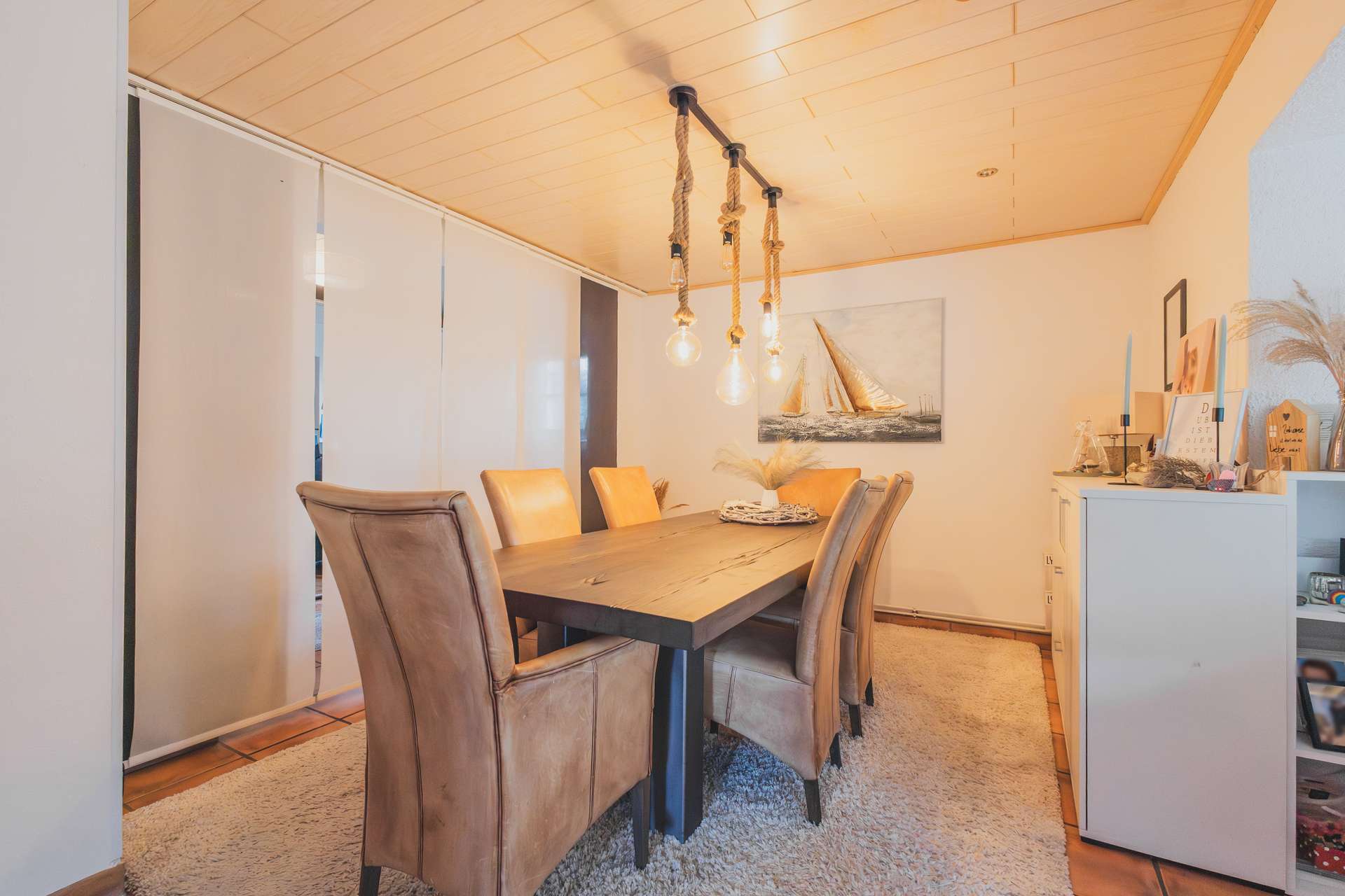 Schon beim Betreten des gepflegten Eingangsbereichs der Vier-Zimmer-Wohnung wird klar: Hier wohnt es sich großzügig und durchdacht. Der lange Flur verbindet fast alle Räume miteinander und führt direkt in das rund 35 m² große Wohnzimmer mit Erker, Kaminofen und bodentiefen Fenstern. Von hier aus öffnet sich ein weiteres Zimmer, derzeit als Arbeitszimmer genutzt, das sich ebenso als Kinderzimmer eignet. Besonders praktisch: der direkte Zugang zur überdachten Terrasse (ca. 8,5 m²), die zu entspannten Stunden im Freien einlädt.